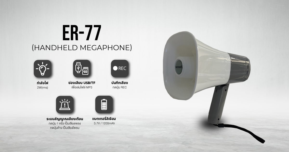 Sherman ER-77 โทรโข่งมือถือ Megaphone 5 นิ้ว ขนาด 2W รองรับไฟล์เสียง MP3 จาก USB พร้อมด้วยแบตเตอรี่ลิเธียม ขนาด 3.7 V/1200mAh